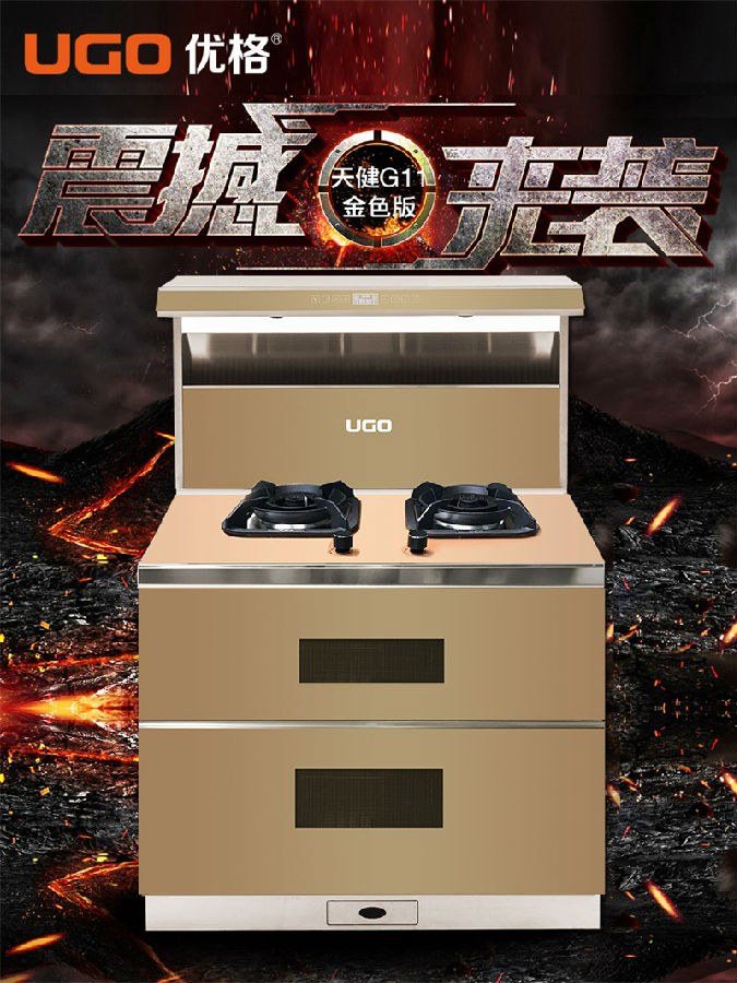集油烟机、燃气灶、消毒柜、储藏柜为一体的天健G11,
